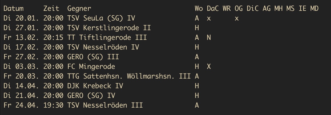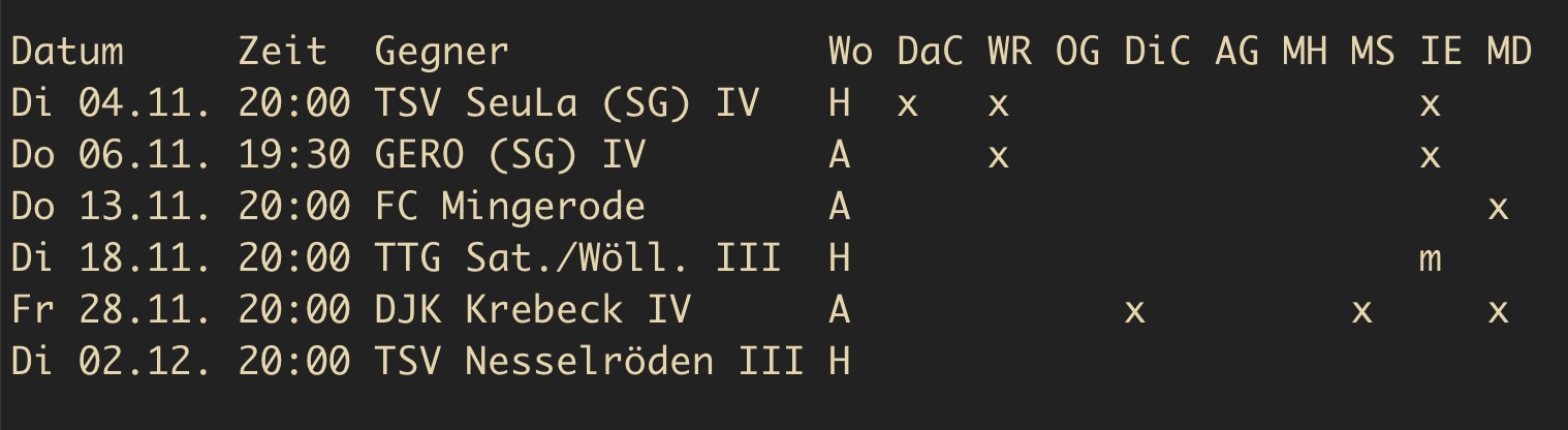 Spiele bei denen jetzt schon klar ist, dass 5 Leute fehlen, sind mit * gekennzeichnet und werden nach Möglichkeit verlegt.